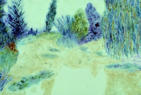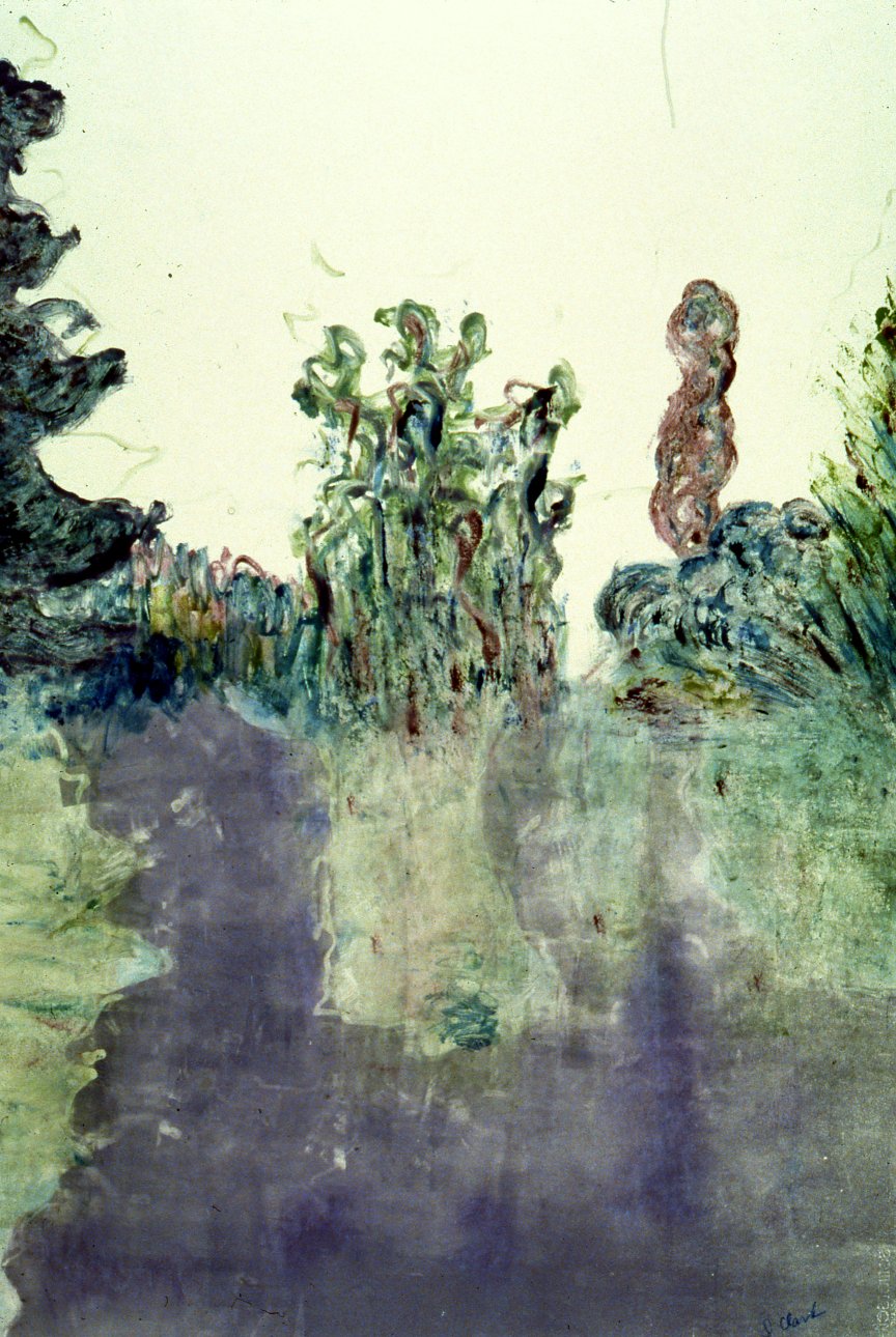 My botanical prints are monotypes conceived of in the chine colle manner. I use inks, dry pigments, and botanical specimens printed at the same time. I may remove a leaf to reveal an impression in the support sheet to emphasize that the work is intended to suggest buried botanical fossils.