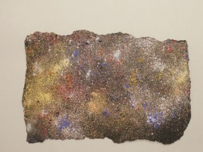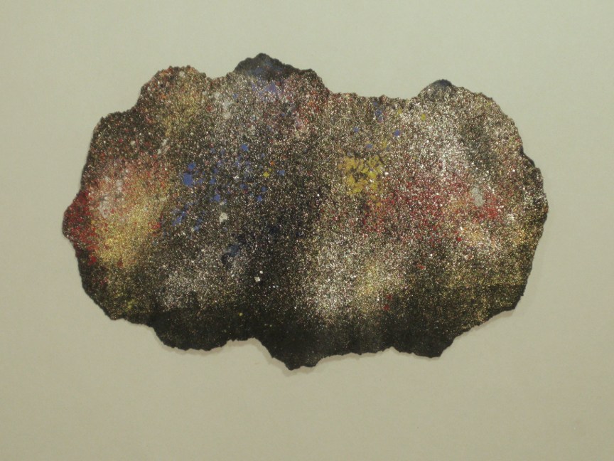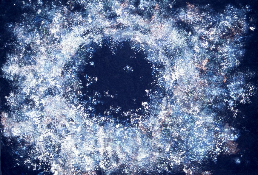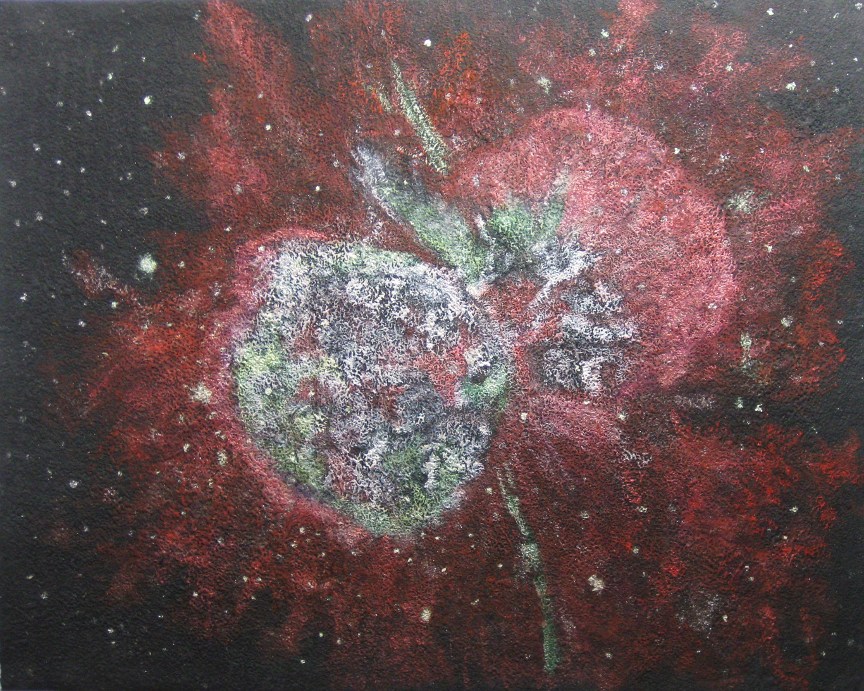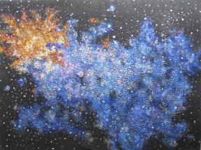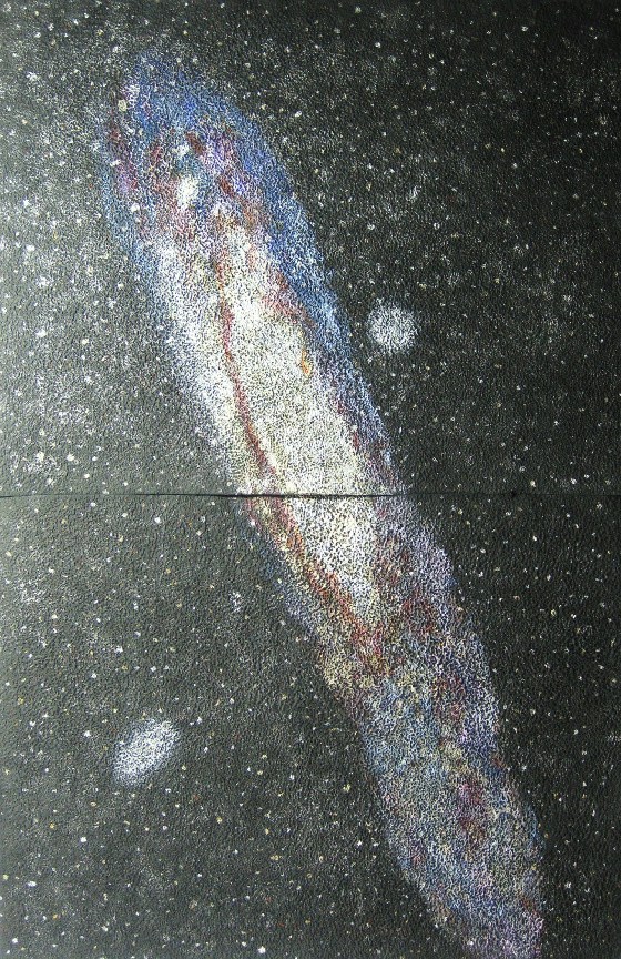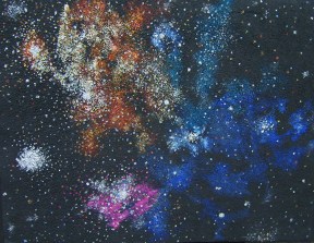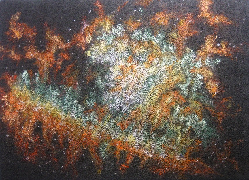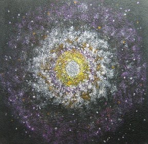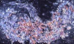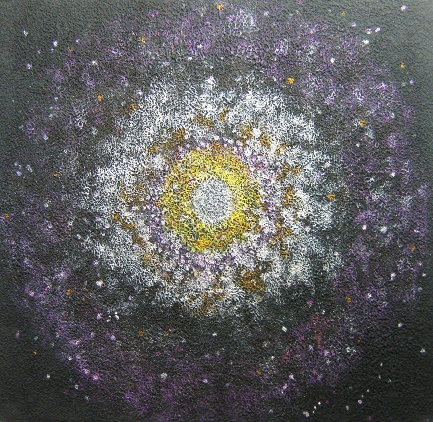Galaxies is painted on a canvas that has been prepared with volcanic particles to create the effect that space is dimensional not flat.