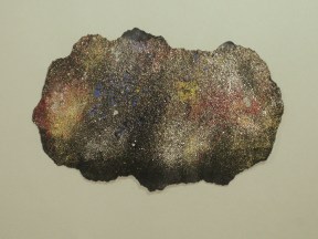 The oil painting is on paper that is prepared with volcanic particles and blue-black paint to create a depth of field.