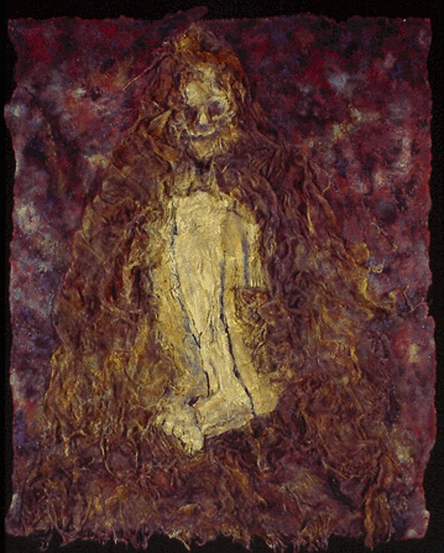 Chullpa, executed in 2001, is the most important work in a series of mixed media paintings, prints and collages that depict sacred burials in antiquity. Ancient peoples are being resurrected and desecrated in the name of a new religion, science. In these artworks specific cultural references to textiles, paintings or artifacts are included along with the figures and are intended to express the unique beauty of each of those civilizations.